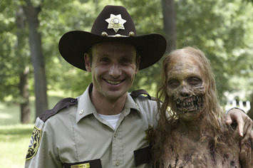This cheery photo clearly comes from a behind-the-scenes moment during the pilot. But oh, what a different story The Walking Dead would be if it shuffled along to this tune.