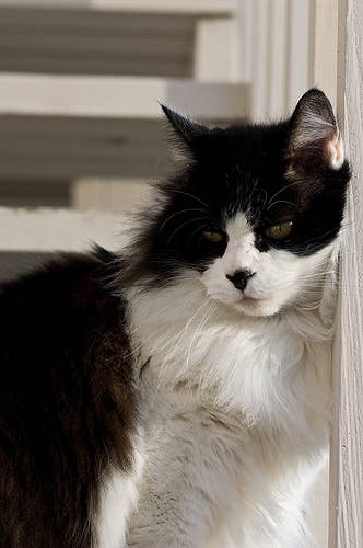 Hi! I can't tell you my name or gender because I can't speak. I also can't tell you if I have a home or not (because I can't speak). Good thing I can type! Anyway, I like hanging out on your steps, and sitting with your cat (and occasionally swatting at her). I think we're friends? P.S. More cat food please!