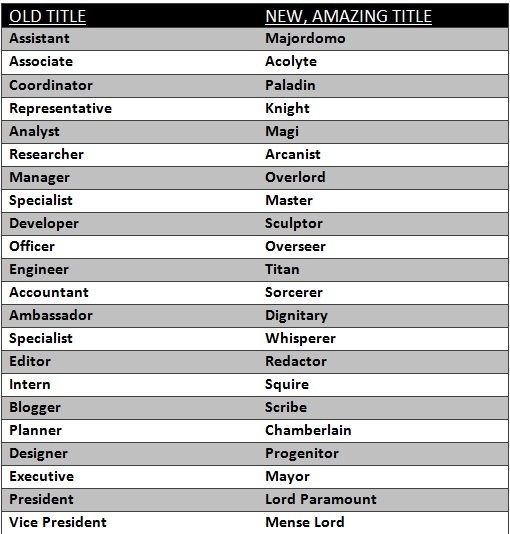 Buzzfeed has you covered. Below is a rubric for changing your regular job title into your new, amazing, cool job title. No longer will you have to sheepishly tell people your occupation. You're not an intern, you're a SQUIRE! You're not an assistant, you're an ACOLYTE!