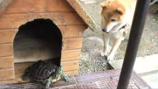 This Shiba Inu is a little confused by the Red Eared Slider squatting in his doghouse. Do you think he'll ever get it back?