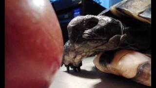 A tortoise tries to eat an apple, but fails. To be honest, the apple is pretty freaky.