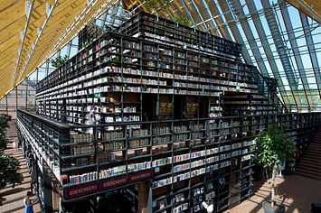 In the market square of Spijkenisse, Netherlands, a mountain of bookshelves is contained by a glass-enclosed structure and pyramidal roof. Corridors and a cafe have panoramic views through the transparent roof.