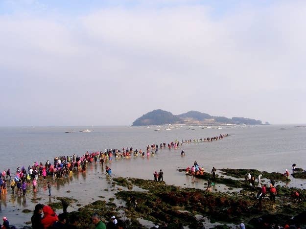 Every year at the end of February and again in mid-June, extremely low tide causes a natural land connecting the main Jindo island and smaller Modo island in South Korea. The pass stays for about an hour before being submerged again.