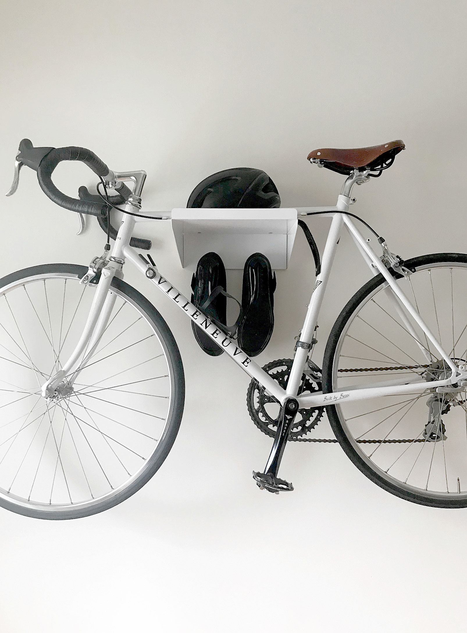 6. A 3-in-1 bike rack that'll give you a place to stash your ride (plus your accessories!). The wide top shelf is the perfect place for keeping your helmet, and there are even under-mounted hooks for hanging your kicks.