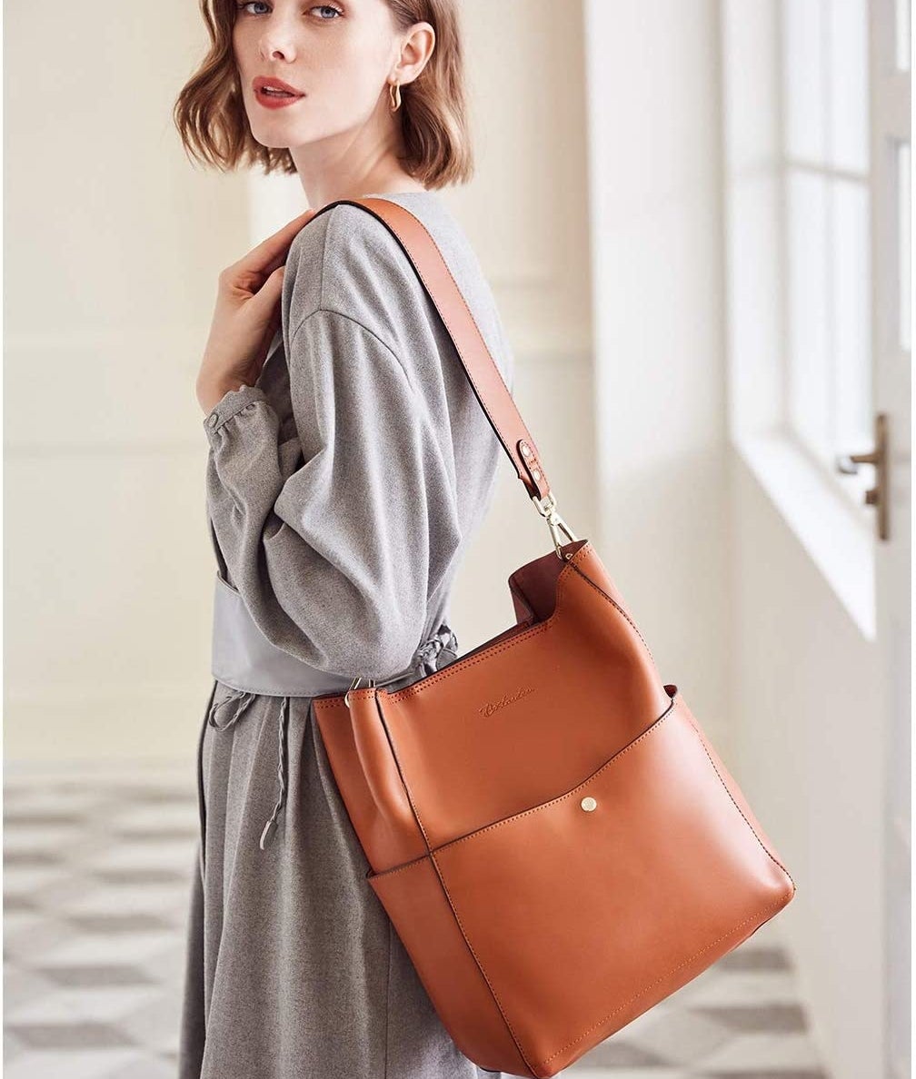 4. A classic leather bucket bag that's perfect for stashing all their essentials. The wide strap won't dig into their shoulders when they're lugging around heavy laptops and books (and there's tons of pockets inside for organizing their stuff).