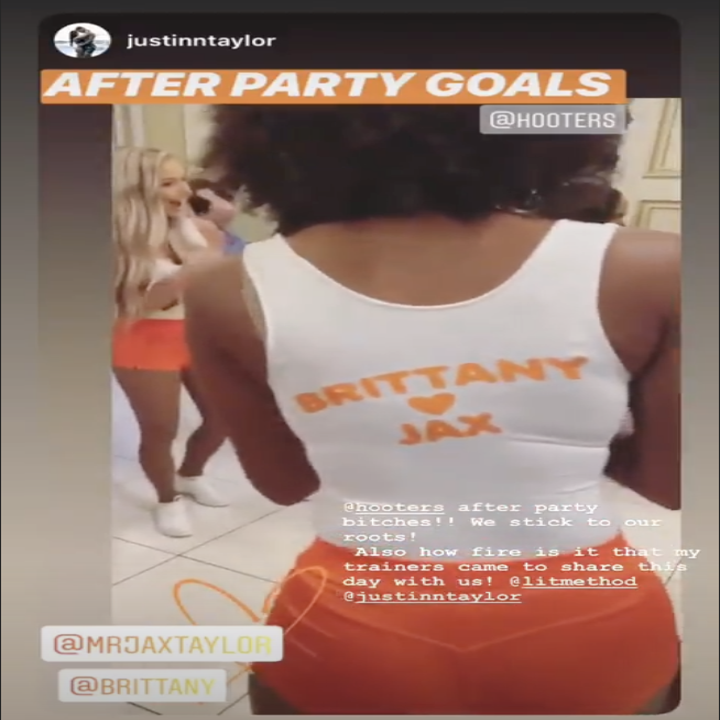 The wedding reception included Hooters girls wearing custom Hooters shirts that said "Brittany <3 Jax" on the back.