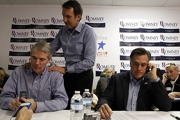 Romney calls potential voters from his campaign headquarters in Charleston, South Carolina, in January while former Minnesota Governor Tim Pawlenty massages the shoulders of Ohio Senator Rob Portman.
